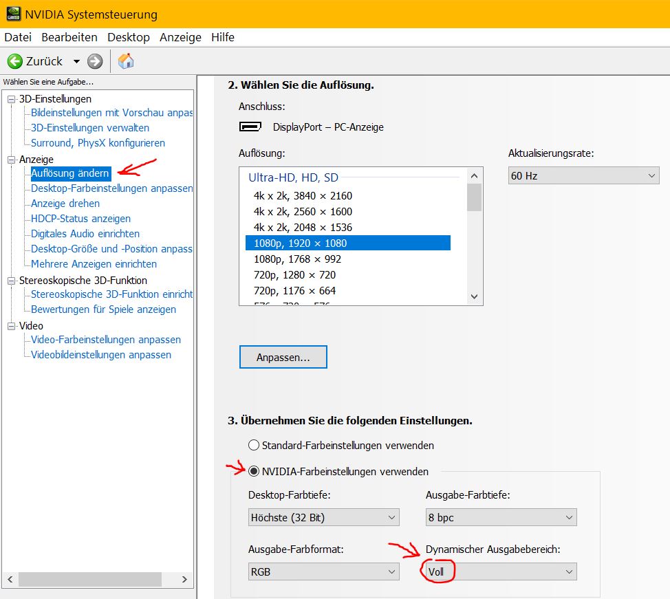 NVidia Systemsteuerung/Auflösung ändern/3. Übernehmen Sie folgende Einstellungen/NVidia Farbeinstellungen verwenden/Dynamischer Ausgabebereich/VOLL