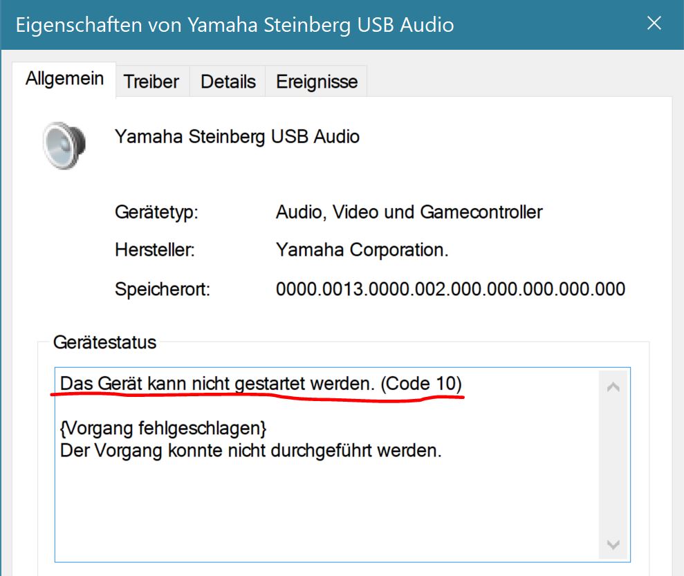 Nach einigen Treiber runter/drauf – EDITOR runter/drauf – USB-Kabel Umgestecke stelle ich folgendes fest. Beim Stecken kommt der USB-Up Ton und KEINE Fehlermeldung. Im Gerätemanager kommt das Gerät “Yamaha Steinberg USB Audio” hinzu geht aber nach einigen Sekunden auf das “gefürchtete” orange Ausrufezeichen.