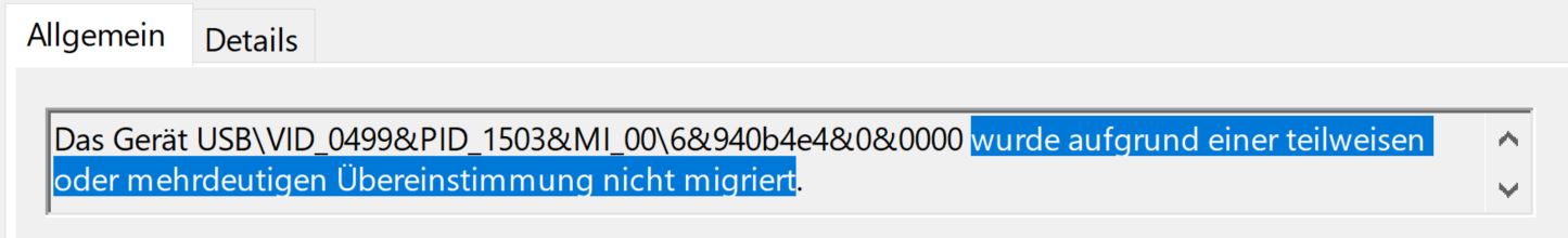 Nach einiger Klickerei komme ich unter Ereignisse/Alle Ereignisse Anzeigen auf eine Meldung “Das Gerät USB … wurde aufgrund einer teilweisen oder mehrdeutigen Übereinstimmung nicht migriert”. Cool, und wann gedenkt Windows das einem Normalmenschen zu sagen ?! Echt, man denkt man ist zu doof, ist man aber nicht.