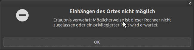 So, kopieren vom YaVDR Rechner zum Arbeitsrechner mit MINT klappt. Aber Files von MINT zum YaVDR Rechner zu kopieren klappt NICHT.  Eine Meldung sagt “Fehler beim Kopieren … Ungültige Antwort erhalten”. Will ich am YaVDR von MINT aus eine Datei löschen kommt “Zugriff verweigert”.