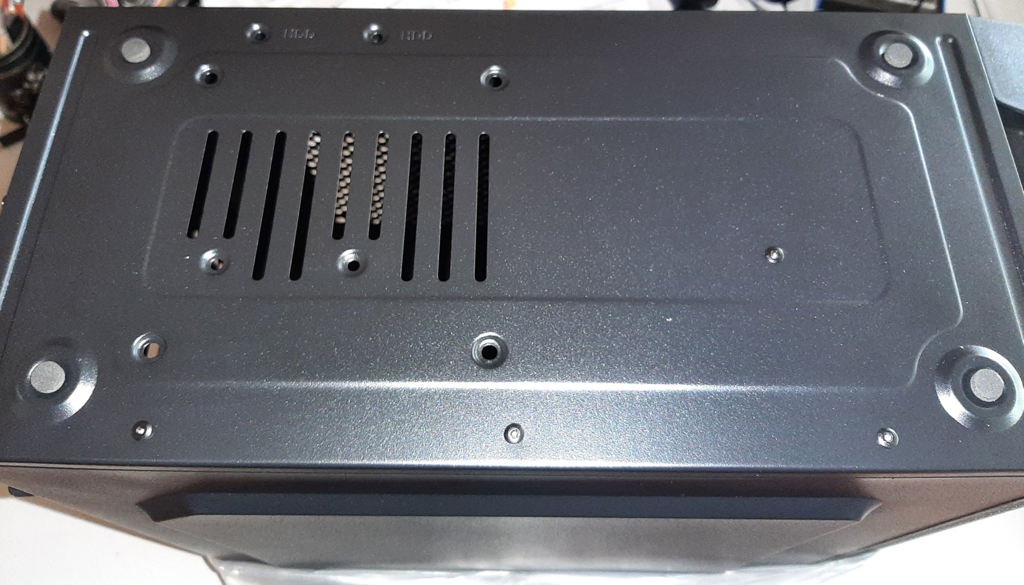Das ist der Boden des Towergehäuse Welcher sogar schwarz lackiert ist. Gut, denn ich muß das Gehäuse ja auf die rechte Seite legen. Schwarz fällt nicht so auf wie nacktes Metall. Ich klebe vier fette Gummifüße an die “Hutze” die wie recherchiert KEINE Lüftungslöcher aufweist.