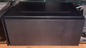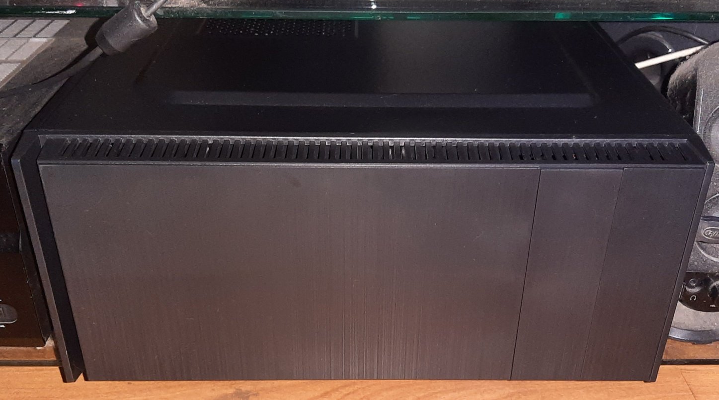 Ist das Teil leise, absolut klasse. Ich schließe das Gehäuse und ab ins Rack. Sieht das dezent aus, nur schwarz gebrusht, perfekt. Und die Bodenplatte ist quasi nicht zu sehen wegen der Nähe zu einem Yamaha Verstärker. Schön und wie geplant liegen die Luftschlitze an der Frontverkleidung über die gesamte Breite oben und unten. Zusätzlich gibt es dann oben noch die Möglichkeit einen 120mm Lüfter anzubringen. Ich probiere es aber erst mal ohne, die Lüftungslöcher lassen warme Luft (steigt nach oben) schön selber raus.
