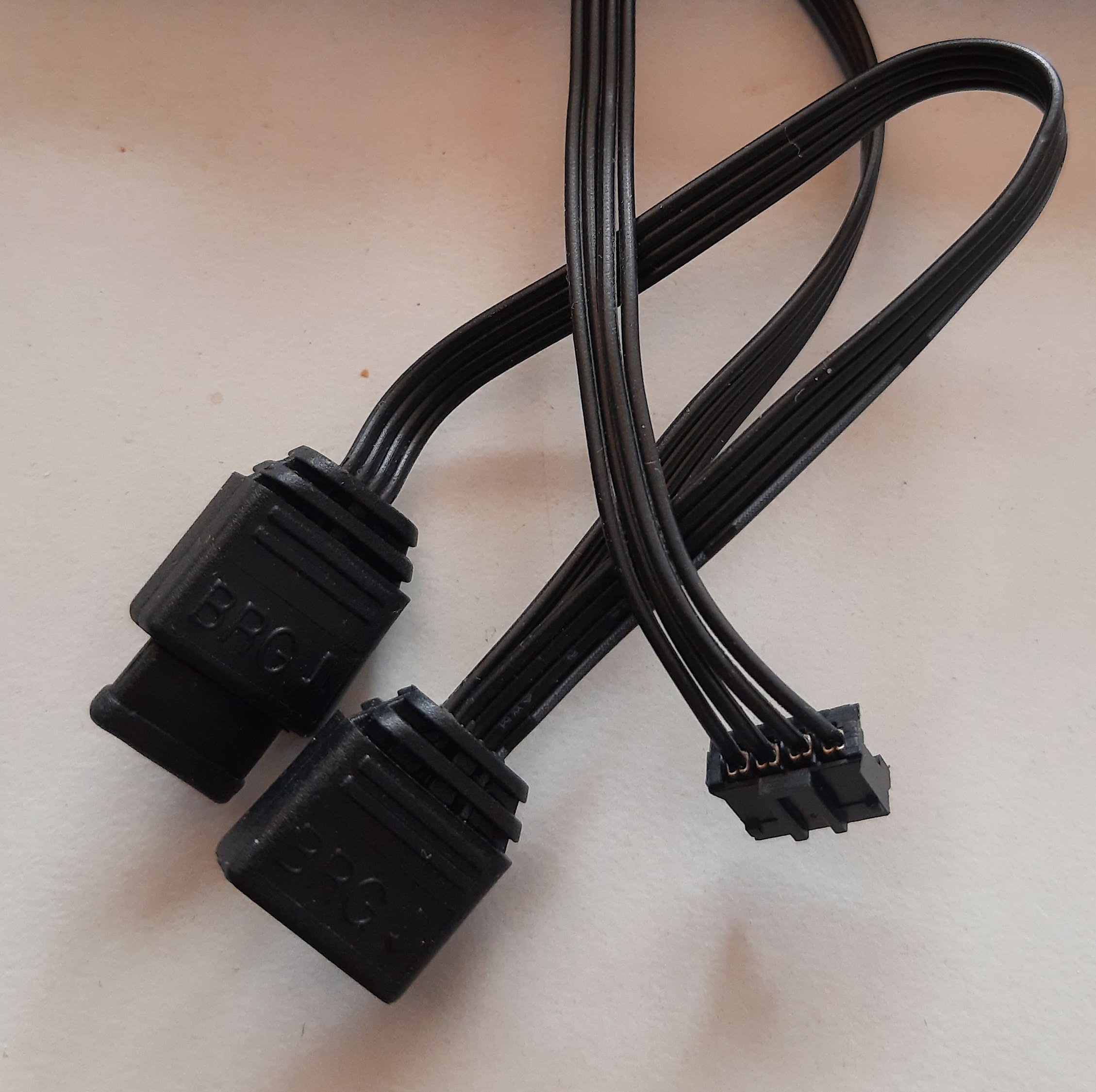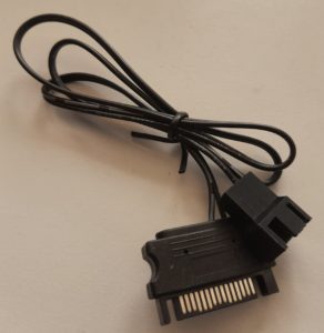 Beiliegend sind allerdings noch zwei weitere Kabel. Eins falls die Stromversorgung des Mainboards für die Pumpe nicht ausreichend wäre. Mit Diesem kann man dann einen Netzteil SATA-Stromkabel anknabbern.