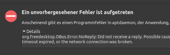 Ich starte wieder die DEB-Datei und wähle diesesmal im Packetbetreuer (der nach wie vor sagt 1.3.0 wäre installiert 🙂 “Erneut installieren”… es kommt unerwartet eine Fehlermeldung.