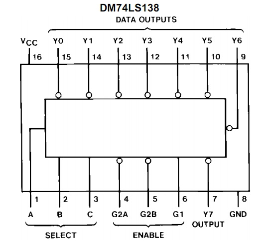 Bei meinen ersten Einplatinencomputern hatte ich immer einen 74LS138 Chip (Demultiplexer) benutzt um die CS (Chip Select) Signale aus den oberen drei Adressbits zu generieren.Das hat jedoch den Nachteil, das man den gesamten Adreßbereich der CPU in 8 gleichgroße Bereiche teilen muss. Der Adreßbereich einer 6502 ist 64kByte, geteilt durch 8 wären das Speicherblöcke von je 8kByte größe. Das ist geradezu verschwenderisch wenn man nur eine PIO oder SIO adressieren will, die gerade einmal zwei oder drei ansprechbare Register besitzen.