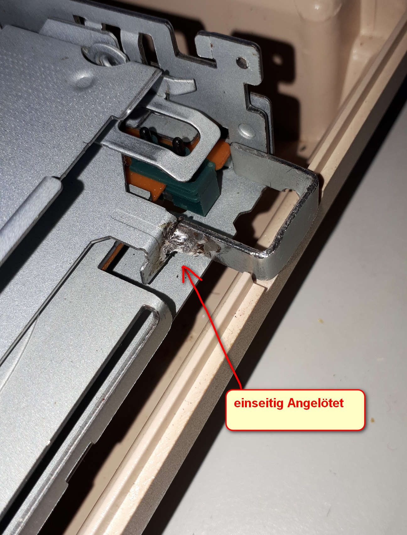 Jetzt kommt das schwierige der Auswurf-Knopf. Zuerst probiere ich den Original irgendwie zu benutzen, keine Chance. Dann baue ich eben Einen aus Metall. Irgendwo sehe ich eine Schiene für ein 2,5″-HDD Laufwerk rumliegen und säge ein U ähnliches Stück ab. Nach einer einstündigen Feil-Arbeit flutscht es endlich. Einseitig am Diskettenlaufwerk angelötet. Paßt, wackelt (kaum 🙂 und hat Luft.