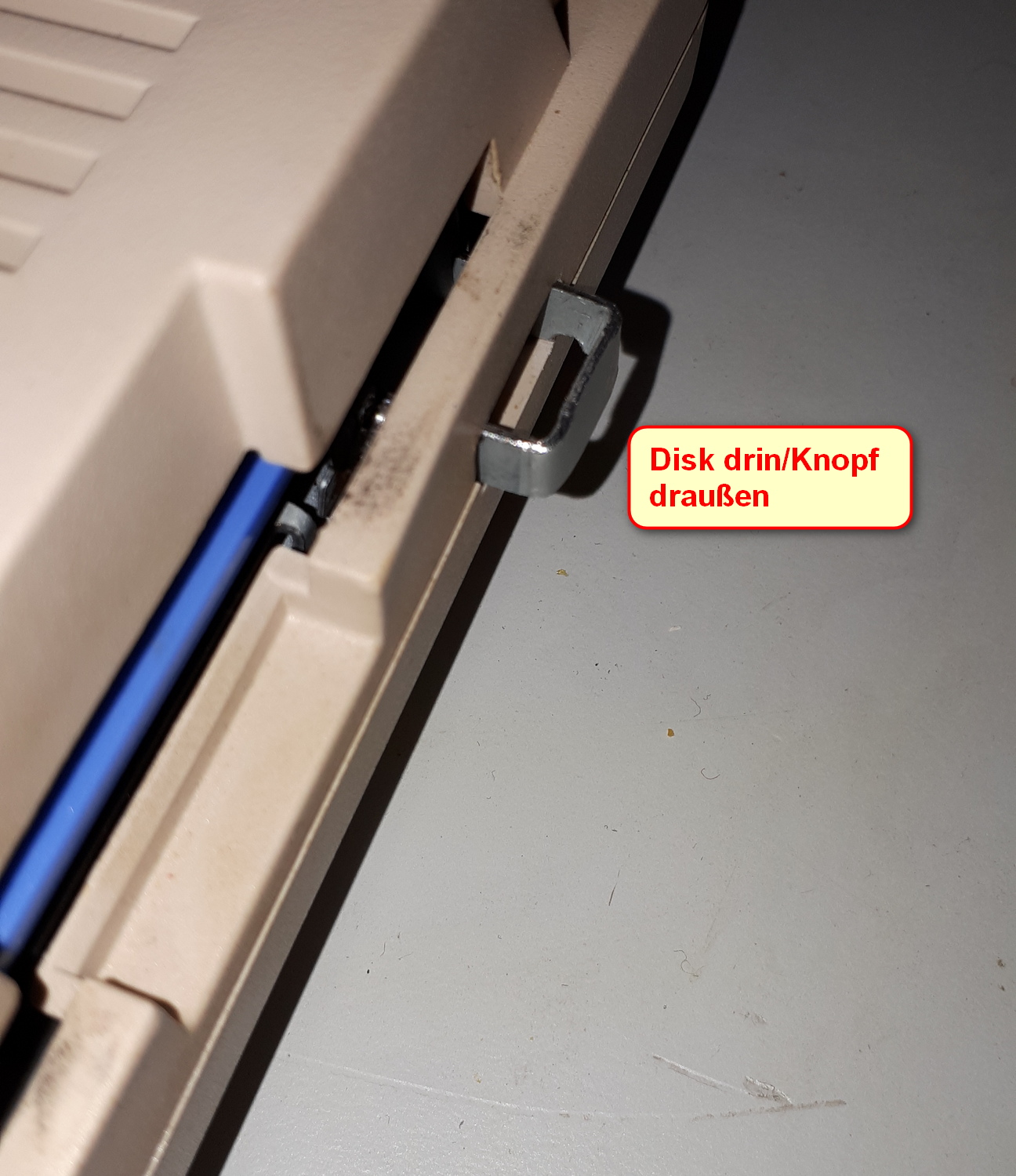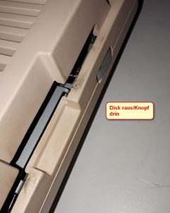 Den Original-Auswurf-Knopf einfach mit TAPE im AMIGA-Gehäuse fixieren. So geht Er nicht verloren.