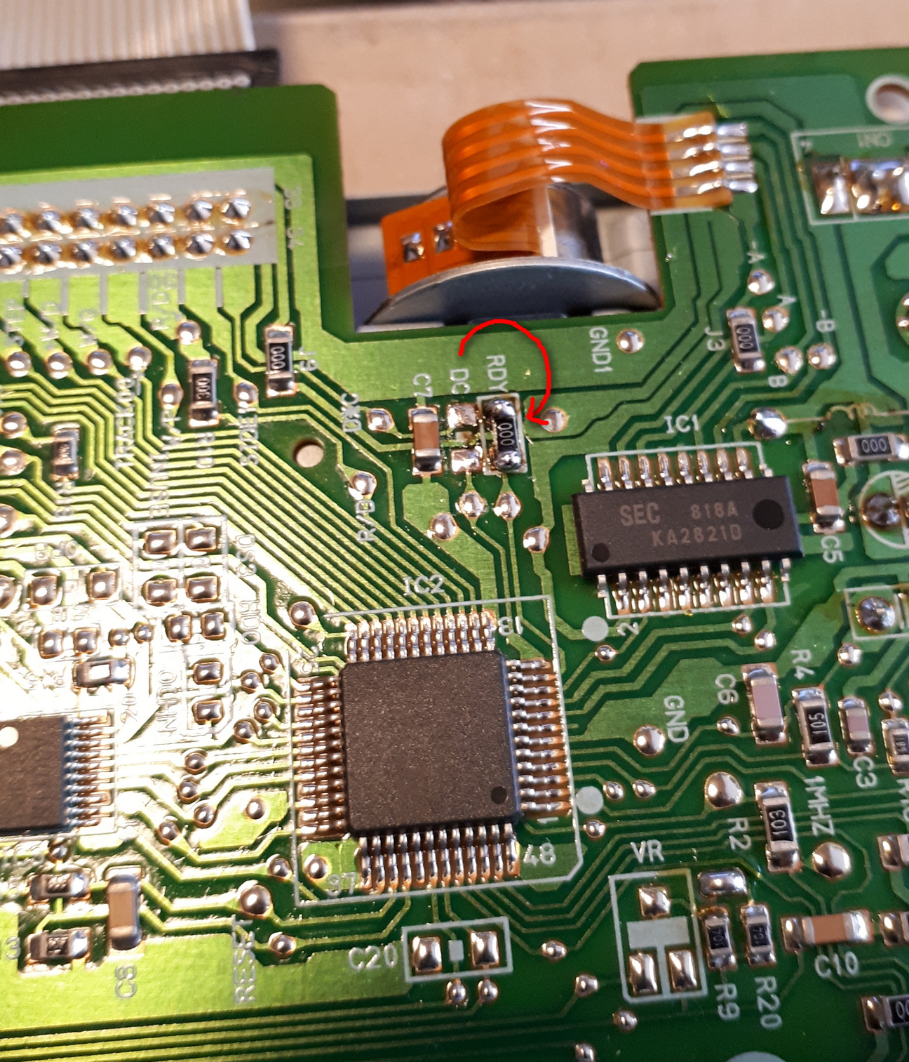 Dann löte ich den NULL-Widerstand bei DC raus und bei RDY wieder ein. Durch das auslöten bei DC wird automatisch PIN 34 des Datenkabelsteckers aufgetrennt.