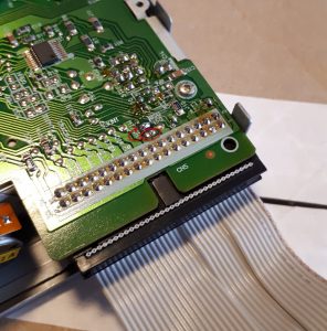 Beim Floppy Einbau stelle ich dann fest “zu kurz”. Noch ein bisschen verlängert ohne zu löten. Wichtig ist das Plus an Pin 1 und Minus an Pin 2 des SFD-321B ankommt.