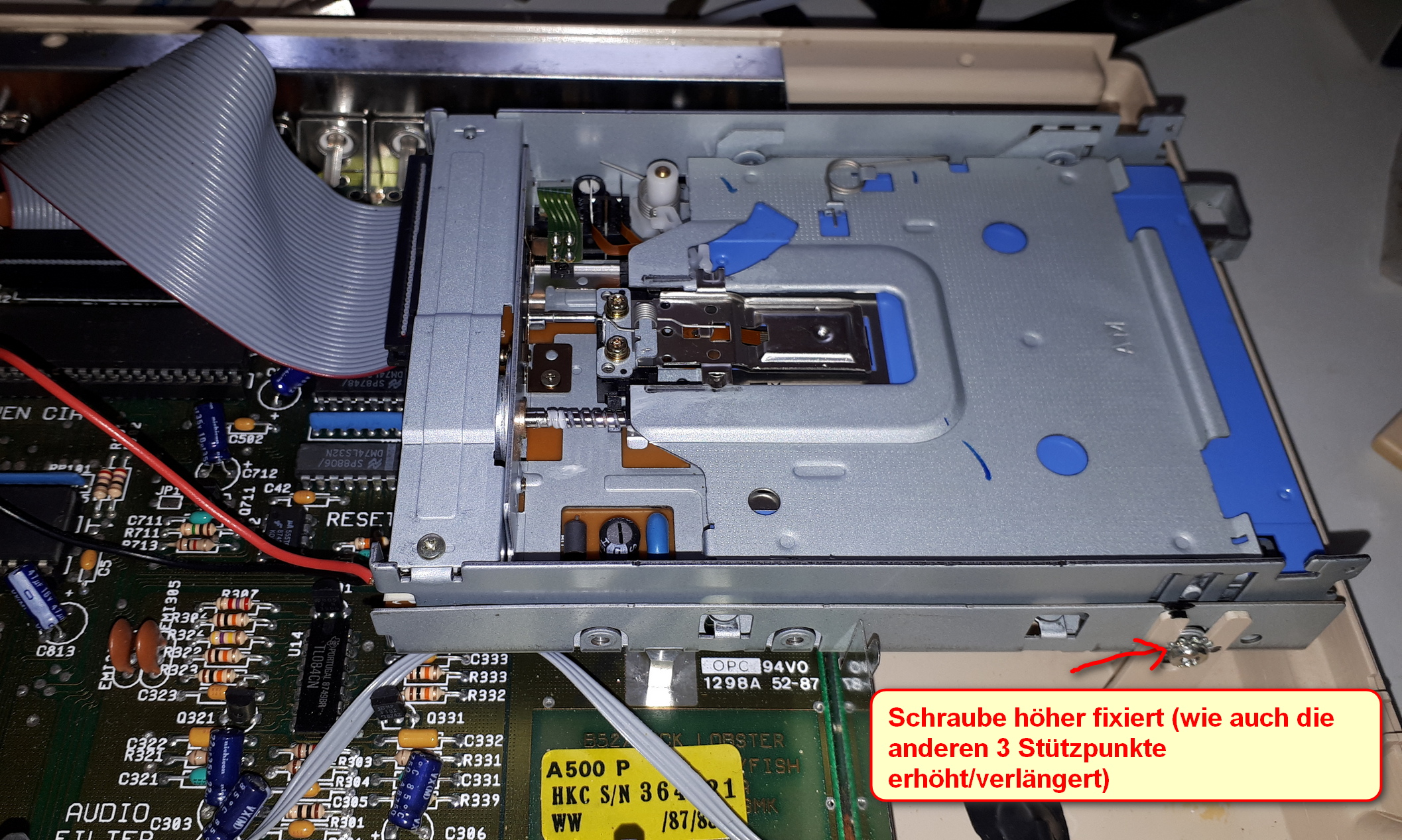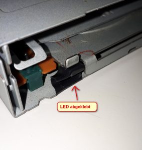 Der 4. Punkt ist die eine seitliche Schraube, die kann ich einfach in der Höhe variieren. Ach ja, die Laufwerk interne LED klebe ich ab, sonst nervt deren leuchten durch den Diskettenschlitz.