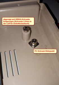 Ich arbeite mit hauchdünnen Unterlegscheiben am Plastikstützpunkt was immense Maß-Auswirkungen hat. Paßt es dann am Diskettenschlitz, drehe ich die beiden Metallstützpunkte bis die Luft weg ist. Zuletzt klappt es endlich mit einer hauchdünnen rötlichen Pappscheibe von PC-Montagen.