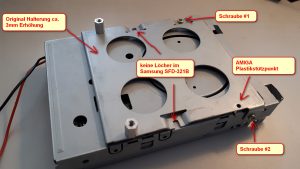 Abends, es lässt mir keine Ruhe. Der Halterahmen am Original-Laufwerk ist mit 4 Schrauben befestigt. Ich demontiert Ihn. Beim Samsung passen nur 2 Schrauben, es fehlen 2 Gewindelöcher. Beide Schrauben fixieren die Halterung aber schon gut.