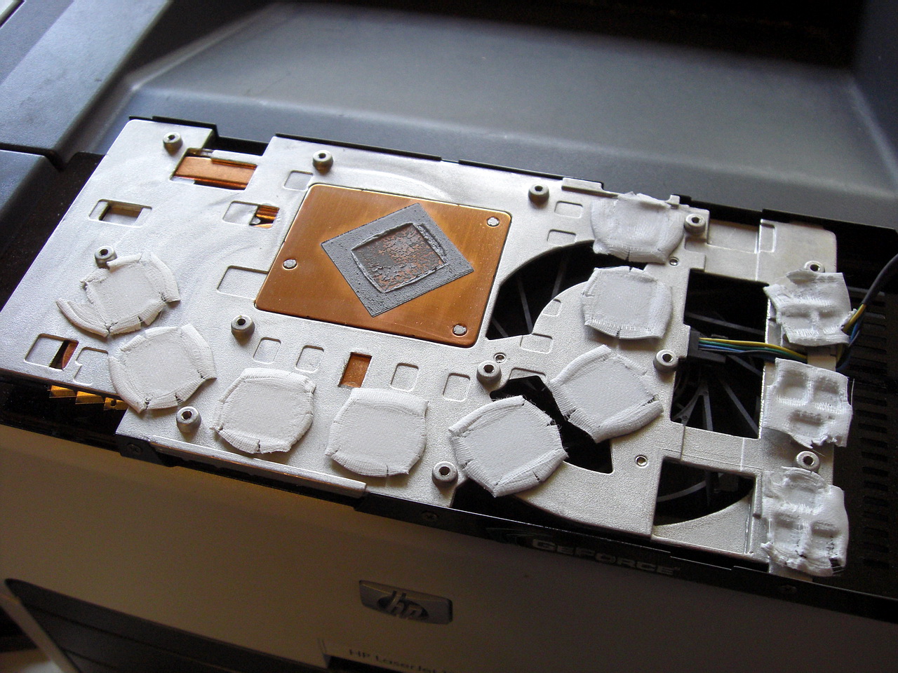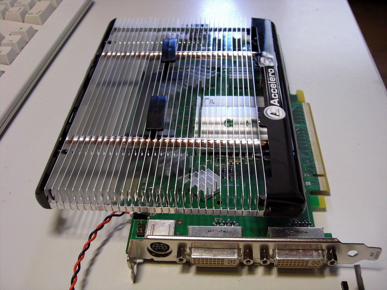 In meinem Arbeits PC habe ich die GeForce 9600GT mit dem Arctic Cooling Accelero S2 für läppische 12 Euro ausgestattet. Den original Kühler habe ich zuerst demontiert. Dieser leistete super Arbeit und drehte nur bei Spielen hoch. Das lautere Geräusch wurde aber von den Geräuschen der Spiele übertönt. Allerdings gab der Lüfter einen hochfrequenten Ton ab der nervte.