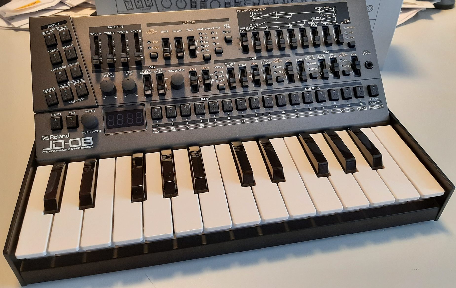 Schlimm wird es evtl. wenn man dann Tones einzeln justiert da die Envelope-Fader die Funktion für Pitch/Filter/Amp teilen. Denn leider hat der JD-08 keine Fader-Pickup Funktion . Bei vielen Synth kann man an einem Symbol im Display sehen, wo der letzte Wert stand. Es würde schon ein Digit-Punkt reichen.