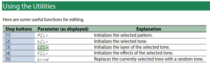 Wie soll man sich das jetzt merken wenn doch Layer/Tones quasi das selbe sind. Um die Verwirrung perfekt zu machen gibt es als erste Funktion noch P.Clr das man intuitiv als PATCH Clear übersetzen würde. Aber nein das steht für PATTERN Clear. Was hat nun wieder eine Pattern-Funktion in den Patch-Utilities zu suchen ? Das erwarte ich dann im Sequenzer-Menü !!
