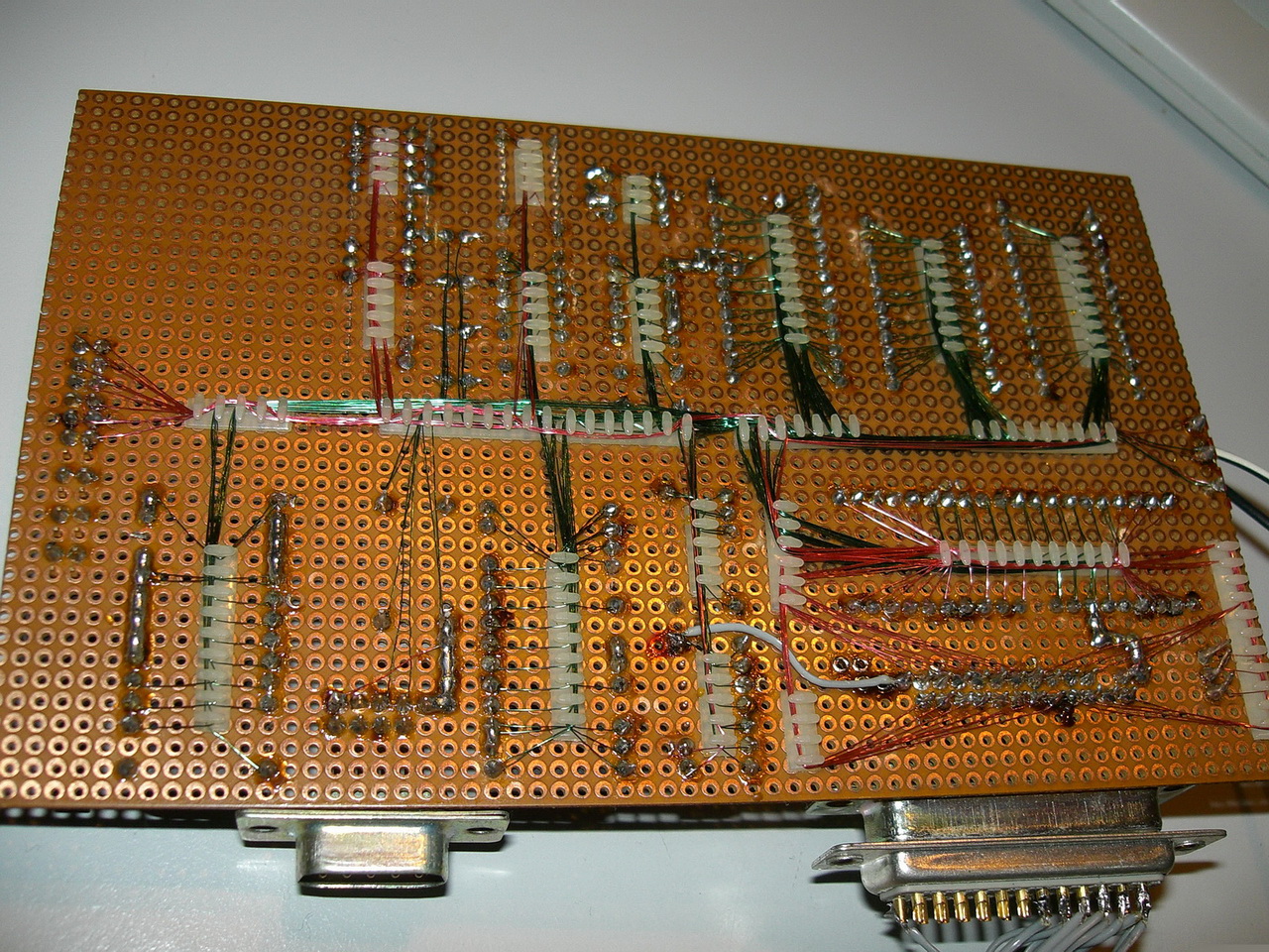 So kann man nach Lust und Laune die Platine erweitern oder auch mal Drähte vorsichtig wieder herausziehen/herausschneiden. Man muß nur darauf achten, das vorhandene Drähte sich nicht beim neu verlöten lösen, was aber recht einfach ist. So sind selbst hochkomplexe Platinen recht schnell erstellt. Und auch 35 Jahre später funktionieren diese Platinen noch. Die Drahtseite sollte entsprechend gut behandelt werden, hält aber durchaus einiges aus. Die Drähtchen dürfen eben nicht durch scharfe Gegenstände blank werden.
